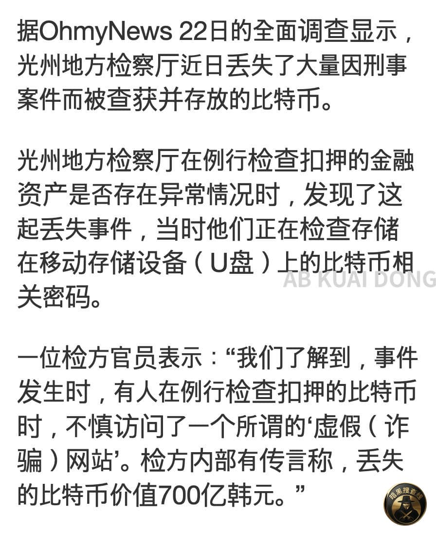 韩国光州地方检察厅,在近期对扣押资产进行清点时,发现比特币不见了。这些比特币的私钥,日常存放在 U 盘里。