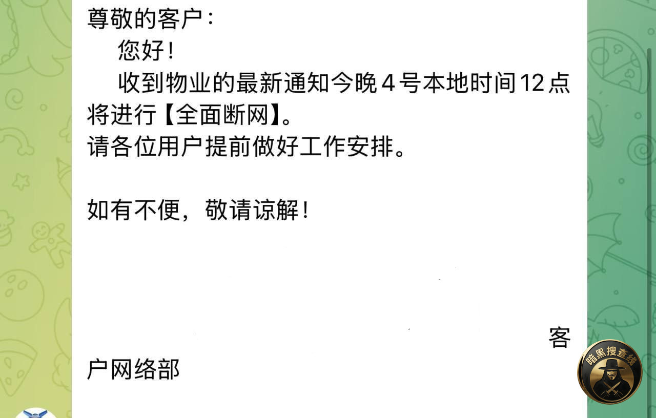 刚刚物业通知了今晚12点断网了