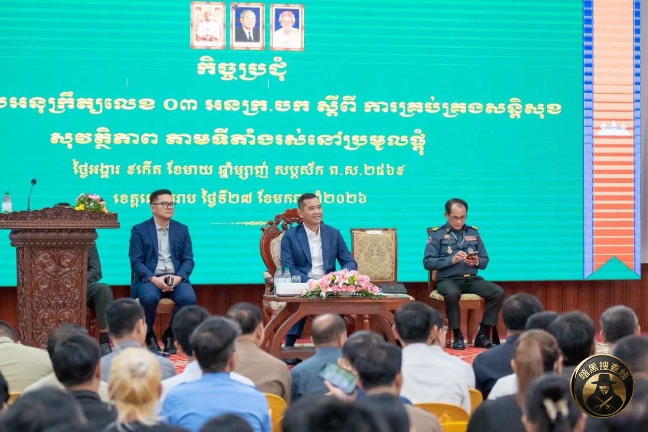 2026年1月27日上午,暹粒省省长普拉克·索蓬先生在暹粒大学主持召开会议,旨在推广《暹粒省住宅区安保管理皇家法令》第03号子法令,以确保安全、社会保障和公共秩序,并提升暹粒省作为柬埔寨旅游省份的形象。