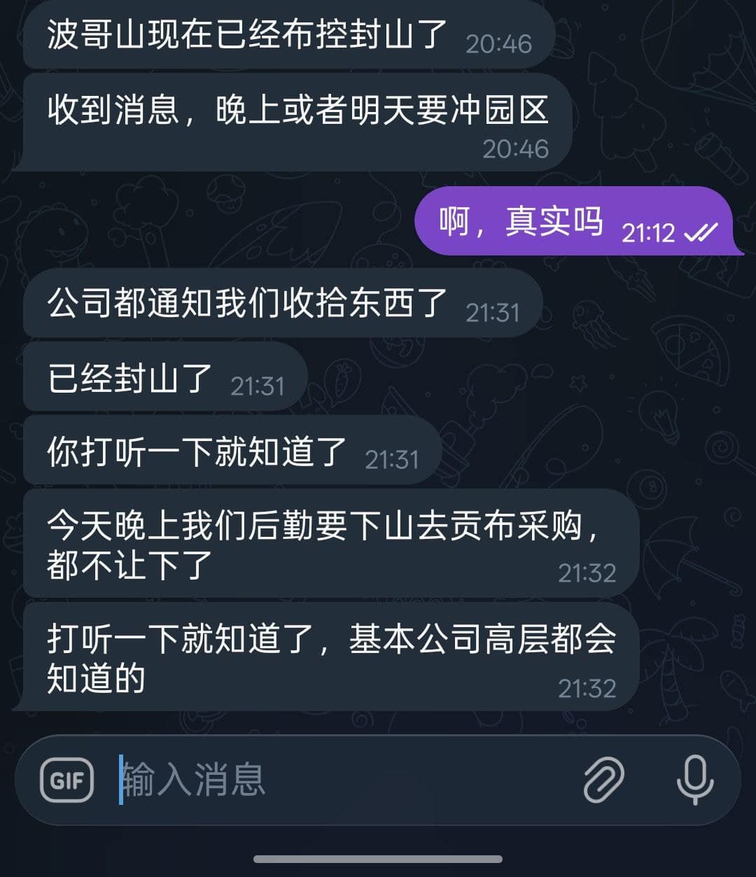 现在已经布控封山了,收到消息,晚上或者明天要冲园区