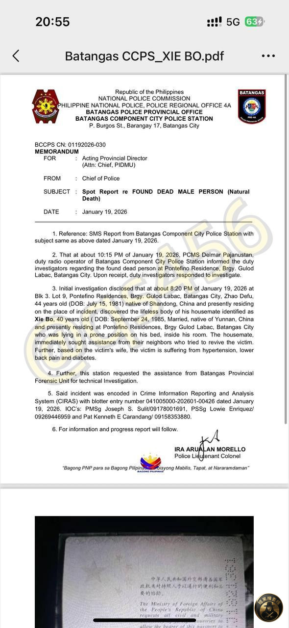 2026 年 1 月 19 日晚约 10 时 15 分,巴丹加斯市警察局值班无线电操作员 PCMS Delmar Pajanustan 向值班调查人员通报,在巴丹加斯市 Gulod Labac 社区 Pontefino 住宅区发现一名死亡人员。接报后,值班调查人员立即前往现场开展调查。