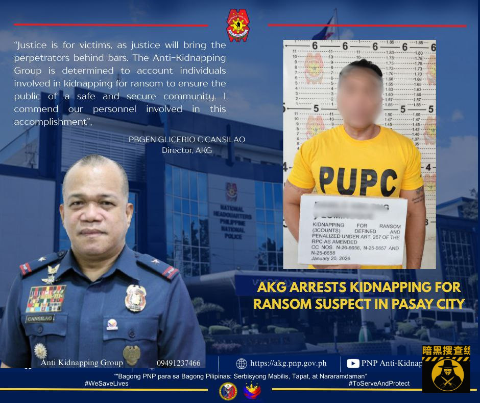 菲律宾国家警察反绑架组(AKG)1月22日通报,一名涉嫌绑架勒索中国公民的要犯丹尼洛·阿比隆(Danilo L. Abilong)在帕赛市再次落网。该嫌犯被指是2025年5月发生在八打雁省纳苏格布的绑架案主谋,#案件涉及两名中国籍及一名韩国籍受害者。