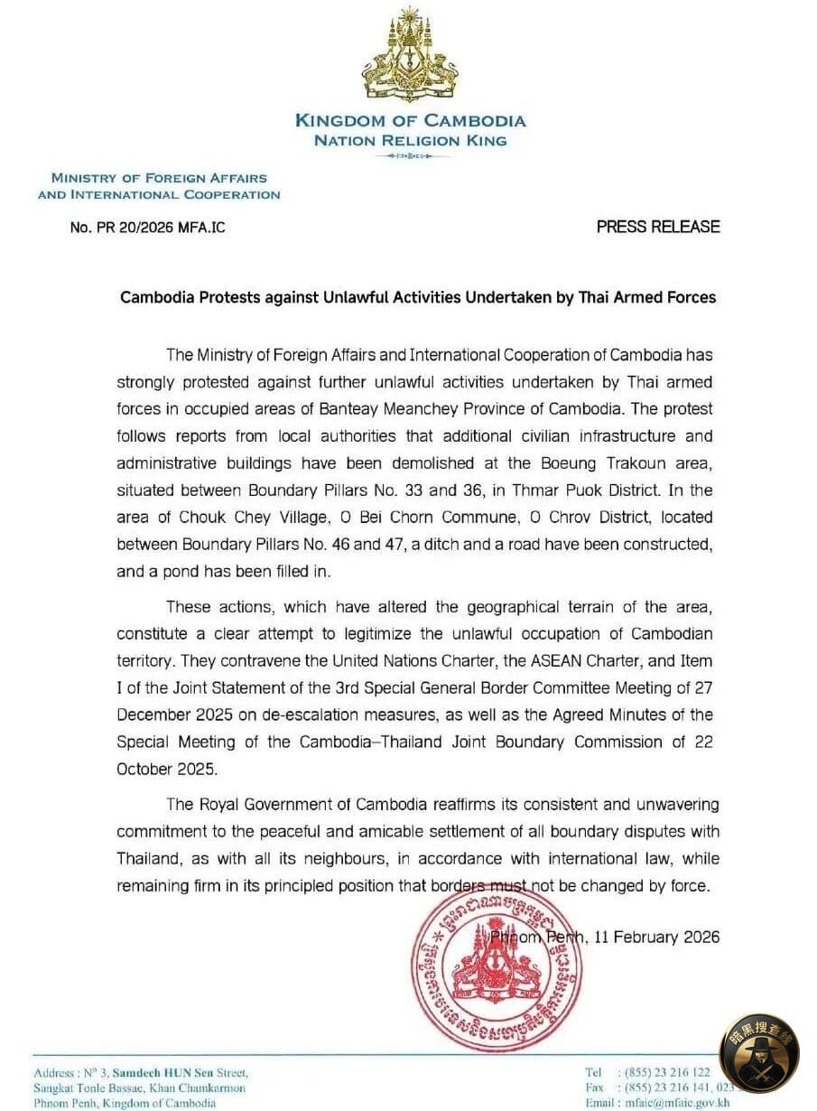 2月11日,柬埔寨外交与国际合作部(外交部)发表声明,就泰国武装部队在柬埔寨领土内持续开展的相关活动提出强烈抗议,指相关行为严重侵犯柬埔寨主权,尤其涉及卜迭棉芷省部分边境地区。