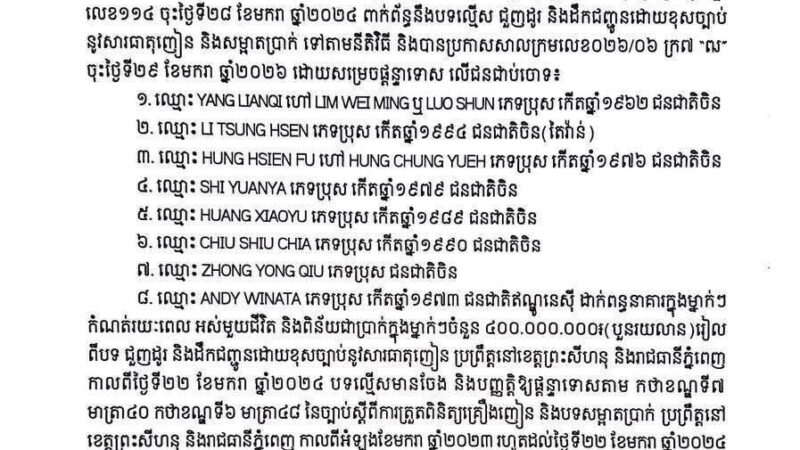 柬埔寨新聞 #柬埔寨新闻 西港特大跨境贩毒洗钱案宣判,8名中印尼籍毒枭被 #柬埔寨新闻 西港特大跨境贩毒洗钱案宣判,8名中印尼籍毒枭被判终身监禁 西哈努克省初级法院今天发布公告,宣布对 […] 30 1 月, 2026 By wellchen2020 尚無留言 Read More