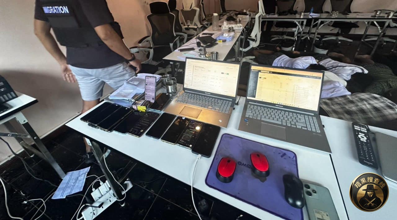 随后,警方当场查扣笔记本电脑、手机等涉案设备共80余件。经核查,所有嫌疑人均持旅游签证入境泰国,涉嫌“外国人无工作许可从事工作或从事超出许可范围的工作”。
