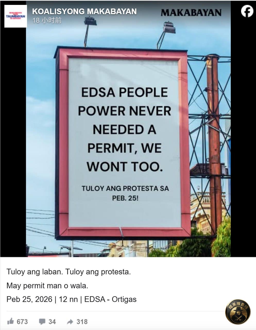 “抗争不止,抗议不停 —— 无论有无许可,” 该团体在脸书帖子中明确表态,“EDSA 人民力量革命从未需要过许可,我们也一样。2 月 25 日,抗议如期举行!”​
